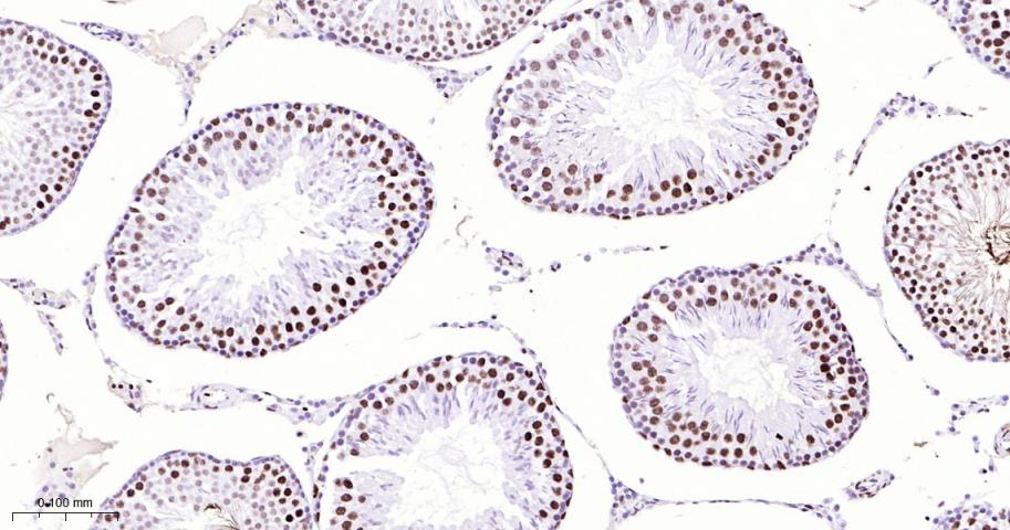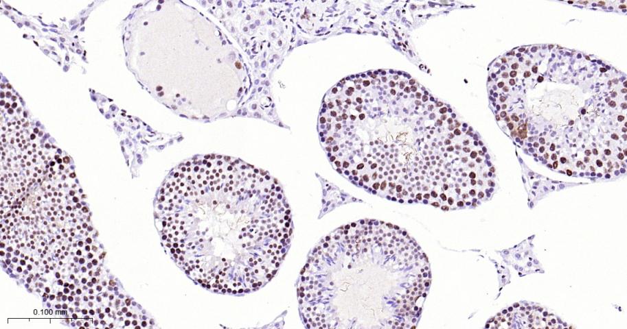 Paraformaldehyde-fixed, paraffin embedded Mouse Testicles; Antigen retrieval by boiling in sodium citrate buffer (pH6.0) for 15 min; The section was incubated with Phospho-POLR2A (Ser5) Monoclonal Antibody, Unconjugated (bsm-62940R) at 1:200 overnight at 4°C, followed by conjugation to the bs-0295G-HRP and DAB (C-0010) staining.