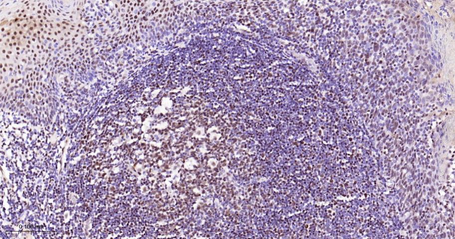 Paraformaldehyde-fixed, paraffin embedded Human Tonsil; Antigen retrieval by boiling in sodium citrate buffer (pH6.0) for 15 min; The section was incubated with Phospho-POLR2A (Ser5) Monoclonal Antibody, Unconjugated (bsm-62940R) at 1:200 overnight at 4°C, followed by conjugation to the bs-0295G-HRP and DAB (C-0010) staining.