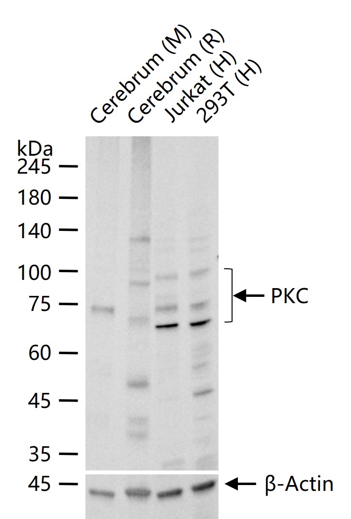 25 ug total protein per lane of various lysates (see on figure) probed with PKC monoclonal antibody, unconjugated (bsm-62952R) at 1:2000 dilution and 4°C overnight incubation. Followed by conjugated secondary antibody incubation at r.t. for 60 min.