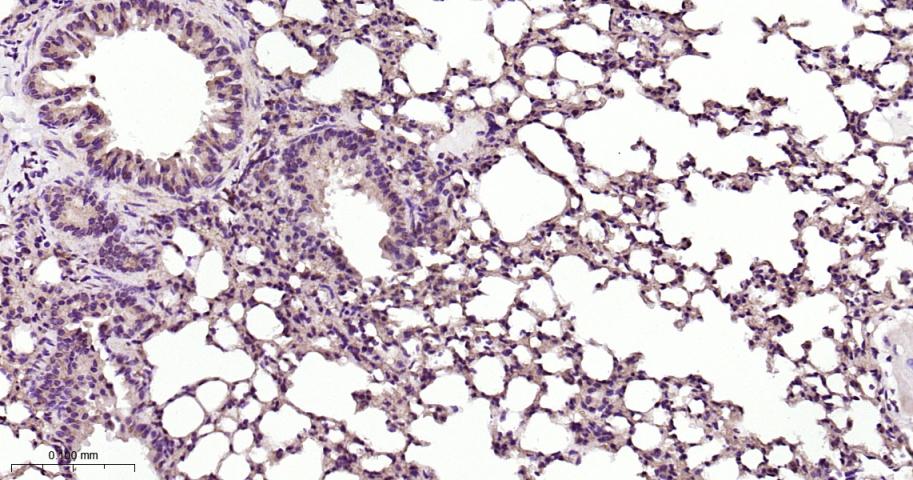 Paraformaldehyde-fixed, paraffin embedded Mouse Lung; Antigen retrieval by boiling in sodium citrate buffer (pH6.0) for 15 min; Antibody incubation with PKC Monoclonal Antibody, Unconjugated(bsm-62952R) at 1:200 overnight at 4°C, followed by conjugation to the bs-0295G-HRP and DAB (C-0010) staining.