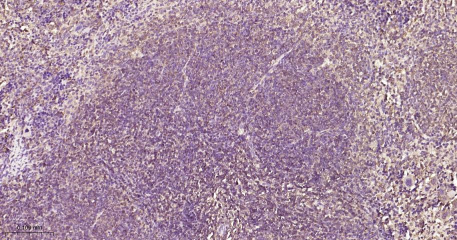 Paraformaldehyde-fixed, paraffin embedded Mouse Spleen; Antigen retrieval by boiling in sodium citrate buffer (pH6.0) for 15 min; Antibody incubation with PKC Monoclonal Antibody, Unconjugated(bsm-62952R) at 1:200 overnight at 4°C, followed by conjugation to the bs-0295G-HRP and DAB (C-0010) staining.