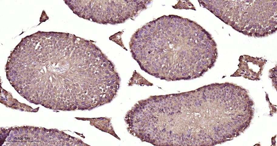 Paraformaldehyde-fixed, paraffin embedded Mouse Testicles; Antigen retrieval by boiling in sodium citrate buffer (pH6.0) for 15 min; Antibody incubation with PKC Monoclonal Antibody, Unconjugated(bsm-62952R) at 1:200 overnight at 4°C, followed by conjugation to the bs-0295G-HRP and DAB (C-0010) staining.