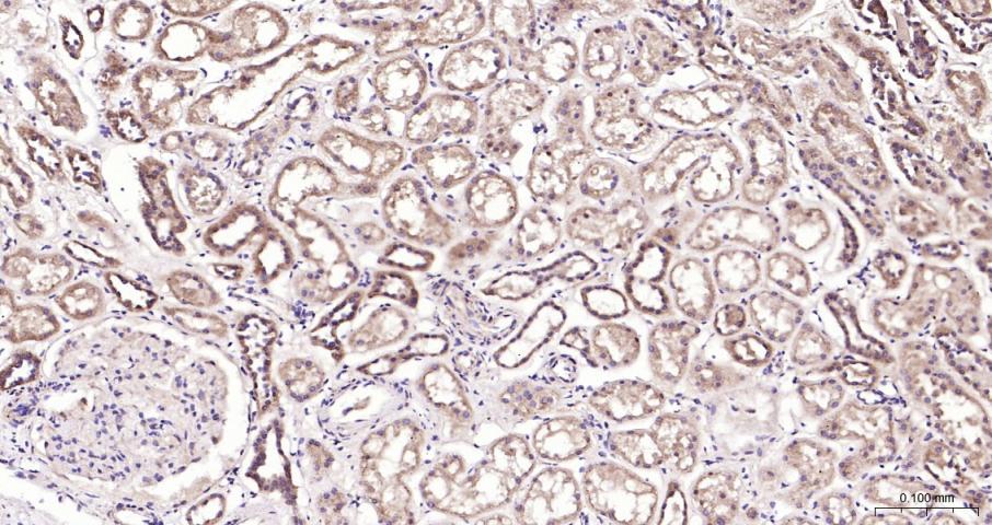 Paraformaldehyde-fixed, paraffin embedded Human Kidney; Antigen retrieval by boiling in sodium citrate buffer (pH6.0) for 15 min; Antibody incubation with EDG3 Monoclonal Antibody, Unconjugated(bsm-62975R) at 1:200 overnight at 4°C, followed by conjugation to the bs-0295G-HRP and DAB (C-0010) staining.