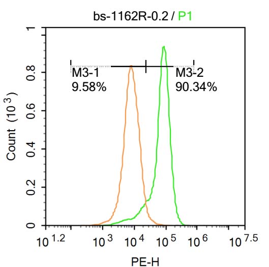 U-937 cells were fixed with 4% PFA for 10min at room temperature,permeabilized with 20% PBST for 20 min at room temperature, and incubated in 5% BSA blocking buffer for 30 min at room temperature. Cells were then stained with bs-1162R Antibody at 1:500 dilution in blocking buffer and incubated for 30 min at room temperature, washed twice with 2%BSA in PBS, followed by secondary antibody incubation for 40 min at room temperature. Acquisitions of 20,000 events were performed. Cells stained with primary antibody (green), and isotype control (orange).