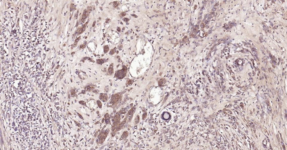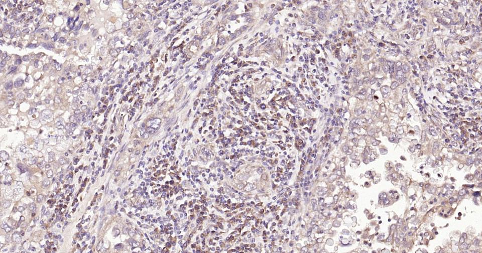 Paraformaldehyde-fixed, paraffin embedded Human Breast Cancer; Antigen retrieval by boiling in sodium citrate buffer (pH6.0) for 15 min; Antibody incubation with DDIT3 Polyclonal Antibody, Unconjugated (bs-1361R) at 1:200 overnight at 4°C, followed by conjugation to the SP Kit (Rabbit, SP-0023) and DAB (C-0010) staining.