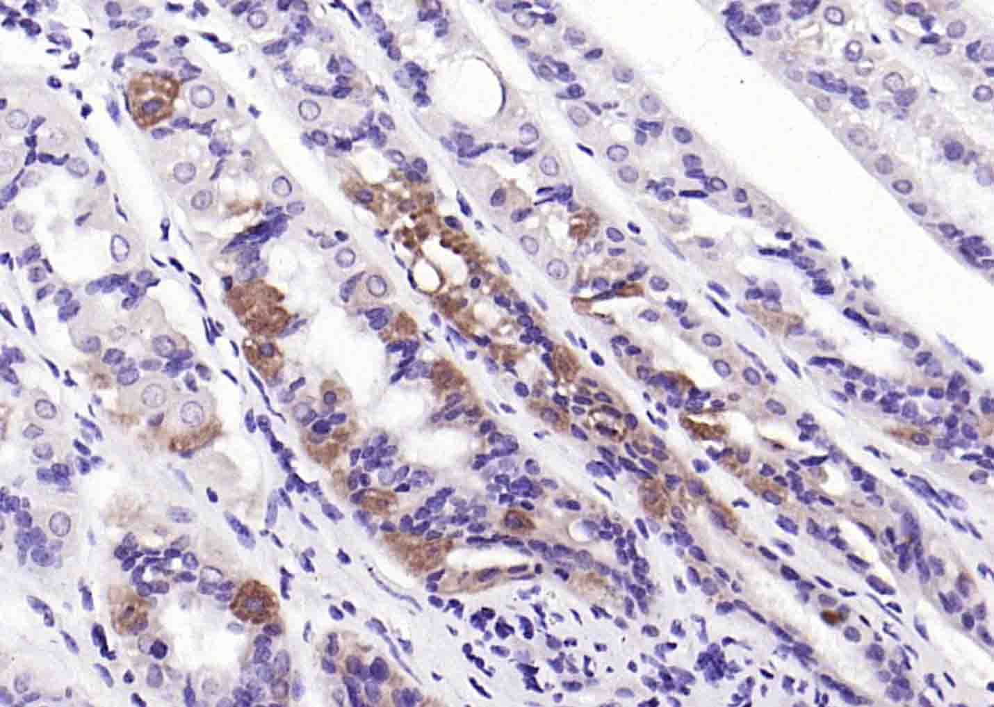 Paraformaldehyde-fixed, paraffin embedded (rat stomach); Antigen retrieval by boiling in sodium citrate buffer (pH6.0) for 15min; Block endogenous peroxidase by 3% hydrogen peroxide for 20 minutes; Blocking buffer (normal goat serum) at 37°C for 30min; Antibody incubation with (Parkin) Polyclonal Antibody, Unconjugated (bs-1865R) at 1:200 overnight at 4°C, followed by operating according to SP Kit(Rabbit) (sp-0023) instructionsand DAB staining.