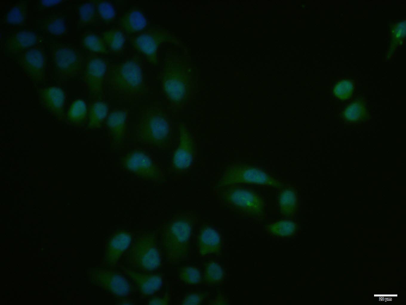 Hela cell; 4% Paraformaldehyde-fixed; Triton X-100 at room temperature for 20 min; Blocking buffer (normal goat serum, C-0005) at 37°C for 20 min; Antibody incubation with (NF1) polyclonal Antibody, Unconjugated (bs-4140R) 1:100, 90 minutes at 37°C; followed by a conjugated Goat Anti-Rabbit IgG antibody at 37°C for 90 minutes, DAPI (blue, C02-04002) was used to stain the cell nuclei.
