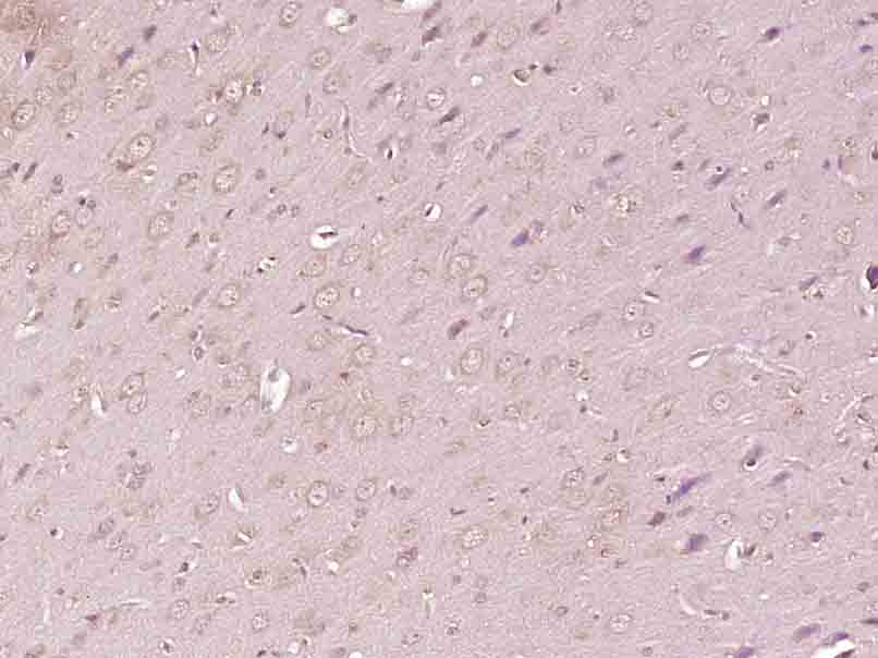 Paraformaldehyde-fixed, paraffin embedded (Rat brain); Antigen retrieval by boiling in sodium citrate buffer (pH6.0) for 15min; Block endogenous peroxidase by 3% hydrogen peroxide for 20 minutes; Blocking buffer (normal goat serum) at 37°C for 30min; Antibody incubation with (TBC1D4) Polyclonal Antibody, Unconjugated (bs-5893R) at 1:400 overnight at 4°C, followed by operating according to SP Kit(Rabbit) (sp-0023) instructionsand DAB staining.