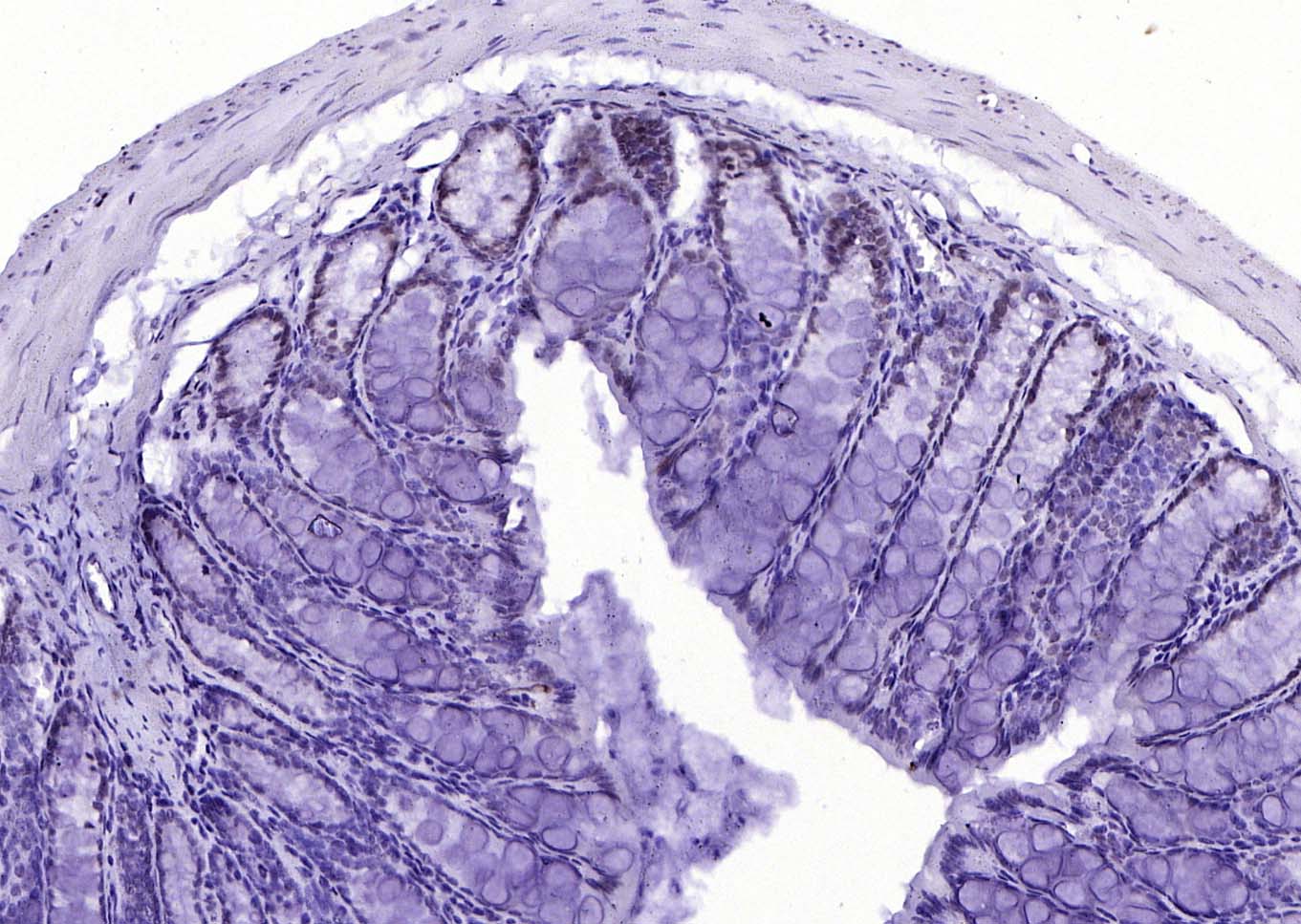 Paraformaldehyde-fixed, paraffin embedded (mouse colon); Antigen retrieval by boiling in sodium citrate buffer (pH6.0) for 15min; Block endogenous peroxidase by 3% hydrogen peroxide for 20 minutes; Blocking buffer (normal goat serum) at 37°C for 30min; Antibody incubation with (MYB) Polyclonal Antibody, Unconjugated (bs-5978R) at 1:200 overnight at 4°C, followed by operating according to SP Kit(Rabbit) (sp-0023) instructionsand DAB staining.