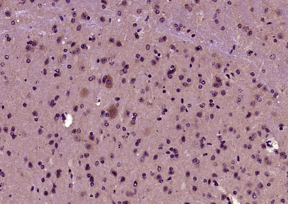 Paraformaldehyde-fixed, paraffin embedded (Mouse brain); Antigen retrieval by boiling in sodium citrate buffer (pH6.0) for 15min; Block endogenous peroxidase by 3% hydrogen peroxide for 20 minutes; Blocking buffer (normal goat serum) at 37°C for 30min; Antibody incubation with (CDC2L6) Polyclonal Antibody, Unconjugated (bs-7070R) at 1:400 overnight at 4°C, followed by operating according to SP Kit(Rabbit) (sp-0023) instructionsand DAB staining.