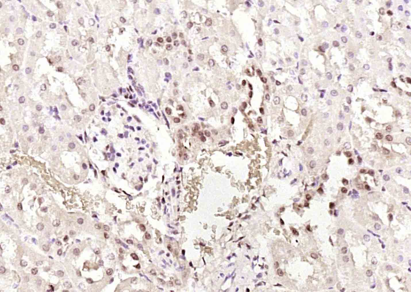 Paraformaldehyde-fixed, paraffin embedded (rat kidney); Antigen retrieval by boiling in sodium citrate buffer (pH6.0) for 15min; Block endogenous peroxidase by 3% hydrogen peroxide for 20 minutes; Blocking buffer (normal goat serum) at 37°C for 30min; Antibody incubation with (PTK5)) Polyclonal Antibody, Unconjugated (bs-6382R at 1:200 overnight at 4°C, followed by operating according to SP Kit(Rabbit) (sp-0023) instructionsand DAB staining.