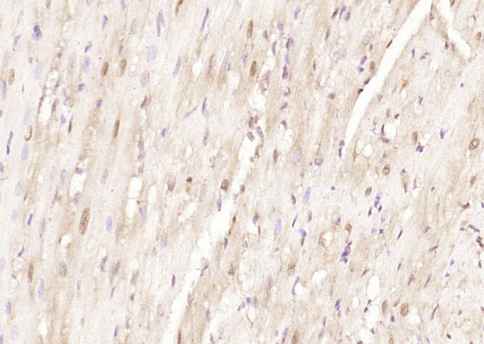 Paraformaldehyde-fixed, paraffin embedded (rat heart); Antigen retrieval by boiling in sodium citrate buffer (pH6.0) for 15min; Block endogenous peroxidase by 3% hydrogen peroxide for 20 minutes; Blocking buffer (normal goat serum) at 37°C for 30min; Antibody incubation with (LRRC2) Polyclonal Antibody, Unconjugated (bs-8360R) at 1:200 overnight at 4°C, followed by operating according to SP Kit(Rabbit) (sp-0023) instructionsand DAB staining.
