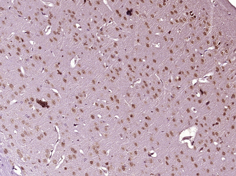 Paraformaldehyde-fixed, paraffin embedded (Mouse brain); Antigen retrieval by boiling in sodium citrate buffer (pH6.0) for 15min; Block endogenous peroxidase by 3% hydrogen peroxide for 20 minutes; Blocking buffer (normal goat serum) at 37°C for 30min; Antibody incubation with (RNF8) Polyclonal Antibody, Unconjugated (bs-9173R) at 1:400 overnight at 4°C, followed by operating according to SP Kit(Rabbit) (sp-0023) instructionsand DAB staining.