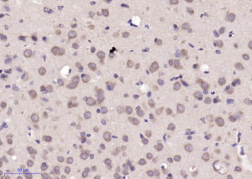 Paraformaldehyde-fixed, paraffin embedded (rat brain); Antigen retrieval by boiling in sodium citrate buffer (pH6.0) for 15min; Block endogenous peroxidase by 3% hydrogen peroxide for 20 minutes; Blocking buffer (normal goat serum) at 37°C for 30min; Antibody incubation with (CNOT8) Polyclonal Antibody, Unconjugated (bs-9388R) at 1:200 overnight at 4°C, followed by operating according to SP Kit(Rabbit) (sp-0023) instructionsand DAB staining.