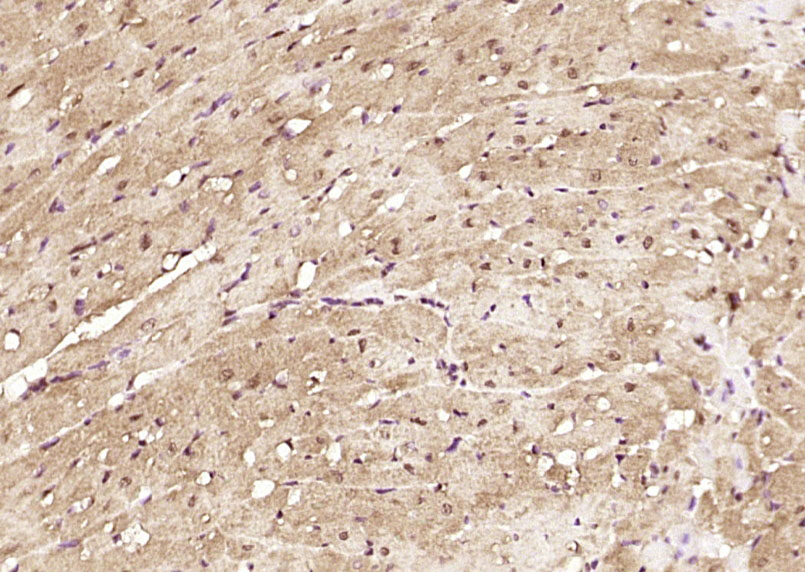 Paraformaldehyde-fixed, paraffin embedded (rat heart); Antigen retrieval by boiling in sodium citrate buffer (pH6.0) for 15min; Block endogenous peroxidase by 3% hydrogen peroxide for 20 minutes; Blocking buffer (normal goat serum) at 37°C for 30min; Antibody incubation with (PRKAG2) Polyclonal Antibody, Unconjugated (bs-9446R) at 1:200 overnight at 4°C, followed by operating according to SP Kit(Rabbit) (sp-0023) instructionsand DAB staining.