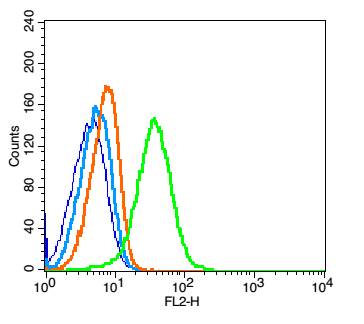 Blank control(Rjai): RAJI(fixed with 2% paraformaldehyde (10 min)). Primary Antibody:Rabbit Anti-TPOR antibody(bs-11311R), Dilution: 1μg in 100 μL 1X PBS containing 0.5% BSA; Isotype Control Antibody: Rabbit IgG(orange) ,used under the same conditions ); Secondary Antibody: Goat anti-rabbit IgG-PE(white blue), Dilution: 1:200 in 1 X PBS containing 0.5% BSA.