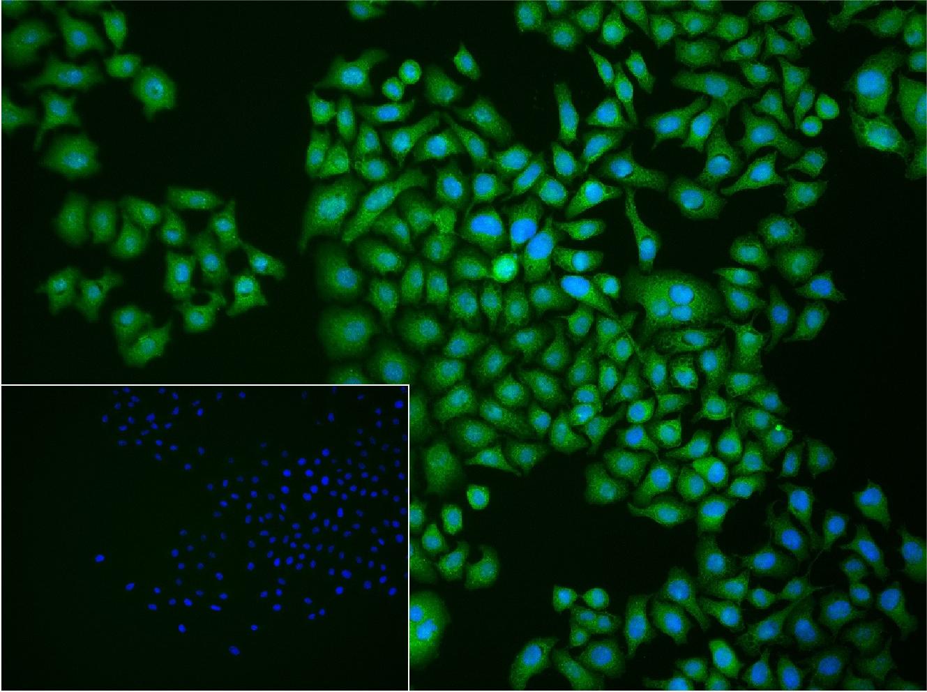 4% Paraformaldehyde-fixed HepG2(H) cell; Triton X-100 at r.t. for 20 min; Antibody incubation with (APOBEC3C) polyclonal Antibody, unconjugated (bs-12495R) 1:50, 90 min at 37°C; followed by conjugated Goat Anti-Rabbit IgG antibody (green, bs-0295G-FITC) at 37°C for 90 min, DAPI (blue, C02-04002) was used to stain the cell nuclei. PBS instead of the primary antibody was used as the blank control.