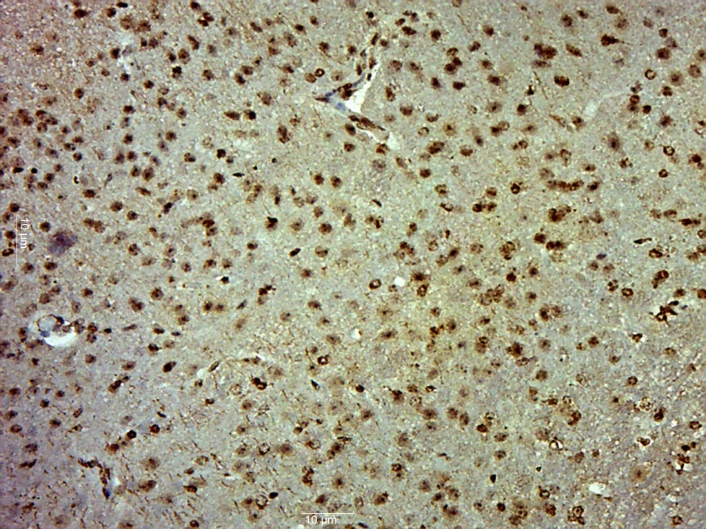 Paraformaldehyde-fixed, paraffin embedded (Mouse brain); Antigen retrieval by boiling in sodium citrate buffer (pH6.0) for 15min; Block endogenous peroxidase by 3% hydrogen peroxide for 20 minutes; Blocking buffer (normal goat serum) at 37°C for 30min; Antibody incubation with (CCDC62) Polyclonal Antibody, Unconjugated (bs-13807R) at 1:500 overnight at 4°C, followed by a conjugated secondary (sp-0023) for 20 minutes and DAB staining.