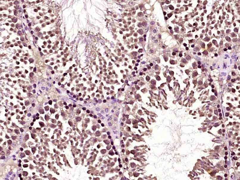 Paraformaldehyde-fixed, paraffin embedded (Mouse testis); Antigen retrieval by boiling in sodium citrate buffer (pH6.0) for 15min; Block endogenous peroxidase by 3% hydrogen peroxide for 20 minutes; Blocking buffer (normal goat serum) at 37°C for 30min; Antibody incubation with (GTF2IRD2) Polyclonal Antibody, Unconjugated (bs-16355R) at 1:400 overnight at 4°C, followed by operating according to SP Kit(Rabbit) (sp-0023) instructionsand DAB staining.