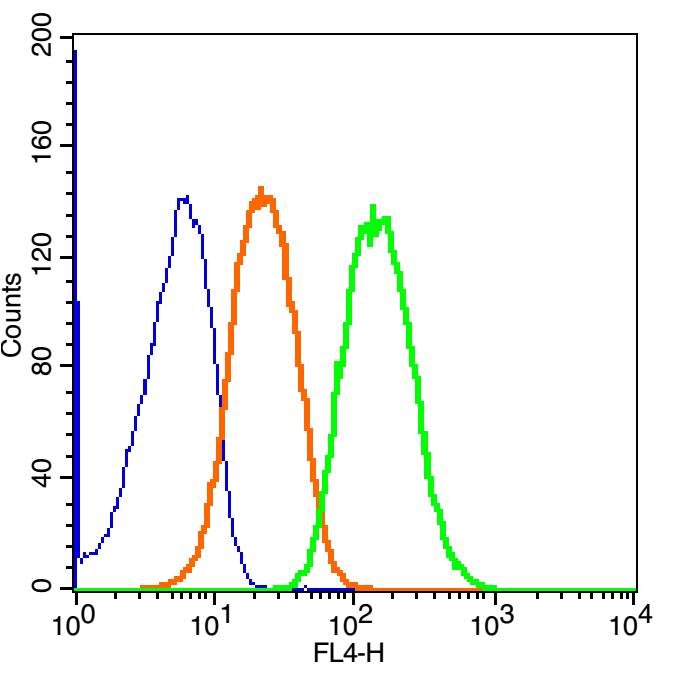 Blank control(blue): RSC96 Cells(fixed with 2% paraformaldehyde (10 min) and then permeabilized with ice-cold 90% methanol for 30 min on ice). Primary Antibody: Rabbit Anti-TTF1/AF647 Conjugated antibody (bs-10539R-AF647), Dilution: 1μg in 100 μL 1X PBS containing 0.5% BSA; Isotype Control Antibody: Rabbit IgG/AF647(orange) ,used under the same conditions.