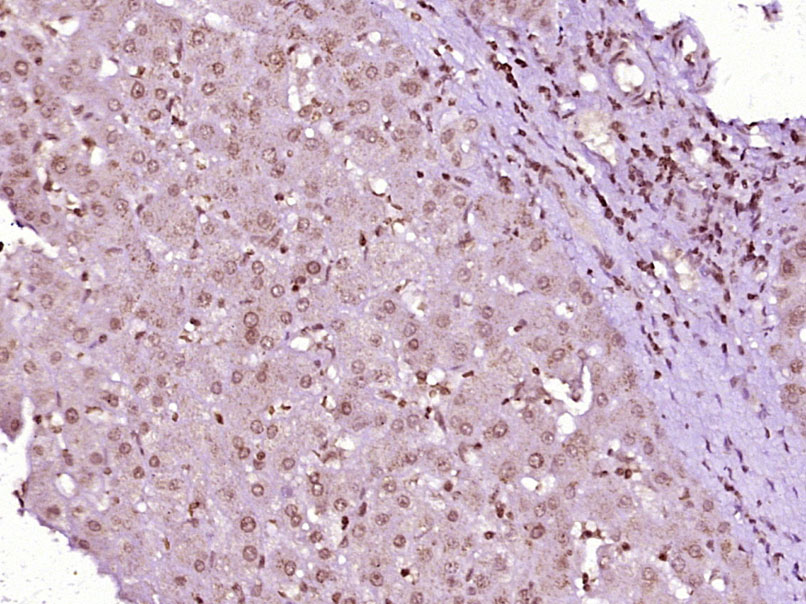 Paraformaldehyde-fixed, paraffin embedded (Human liver); Antigen retrieval by boiling in sodium citrate buffer (pH6.0) for 15min; Block endogenous peroxidase by 3% hydrogen peroxide for 20 minutes; Blocking buffer (normal goat serum) at 37°C for 30min; Antibody incubation with (SFRS8) Polyclonal Antibody, Unconjugated (bs-17302R) at 1:400 overnight at 4°C, followed by operating according to SP Kit(Rabbit) (sp-0023) instructionsand DAB staining.