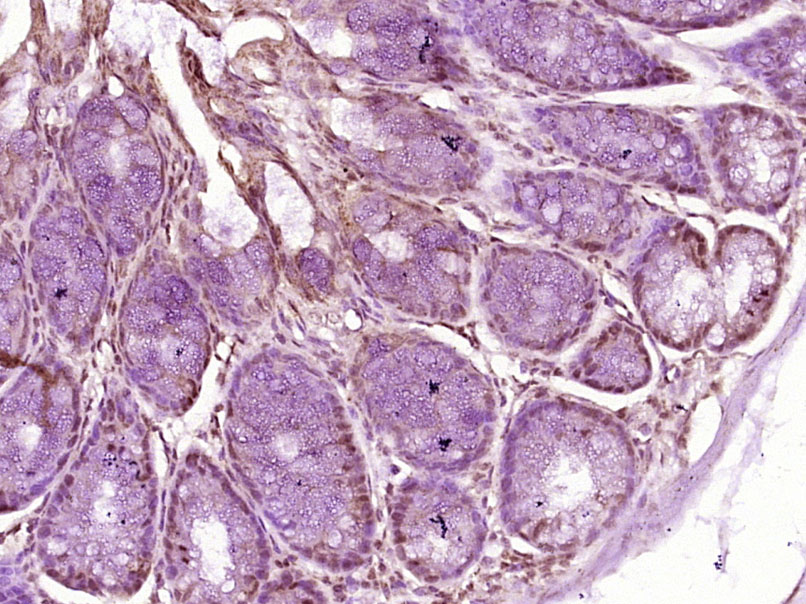 Paraformaldehyde-fixed, paraffin embedded (Mouse colon); Antigen retrieval by boiling in sodium citrate buffer (pH6.0) for 15min; Block endogenous peroxidase by 3% hydrogen peroxide for 20 minutes; Blocking buffer (normal goat serum) at 37°C for 30min; Antibody incubation with (HIST1H2AL) Polyclonal Antibody, Unconjugated (bs-17408R) at 1:400 overnight at 4°C, followed by operating according to SP Kit(Rabbit) (sp-0023) instructionsand DAB staining.