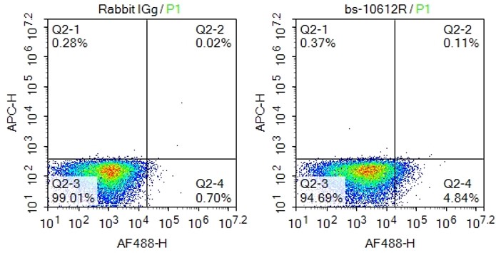 Flow cytometric analysis of Rabbit IgG isotype control (Cat#: bs-10612R) on Neuro-2a(green) compared with control in the absence of primary antibody (blue) followed by Alexa Fluor 488-conjugated goat anti-rabbit IgG(H+L) secondary antibody .