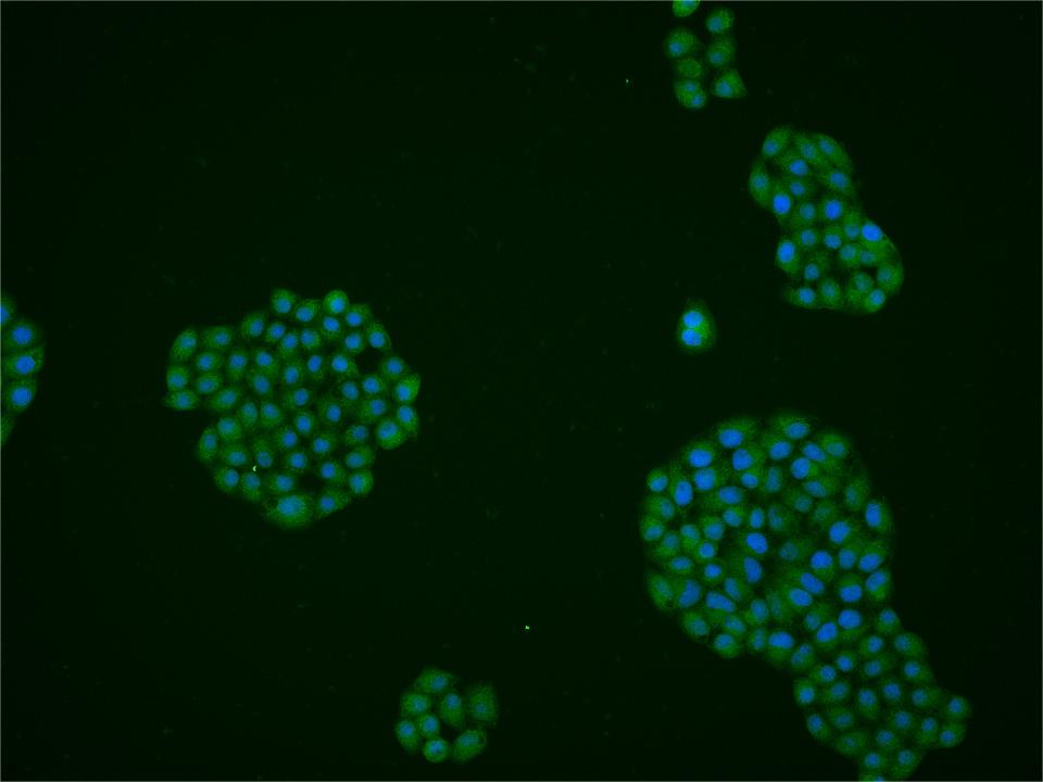 MCF-7 cell; 4% Paraformaldehyde-fixed; Triton X-100 at room temperature for 20 min; Blocking buffer (normal goat serum, C-0005) at 37°C for 20 min; Antibody incubation with (TET3) polyclonal Antibody, Unconjugated (bs-17613R) 1:50, 90 minutes at 37°C; followed by a conjugated Goat Anti-Rabbit IgG antibody at 37°C for 90 minutes, DAPI (blue, C02-04002) was used to stain the cell nuclei.