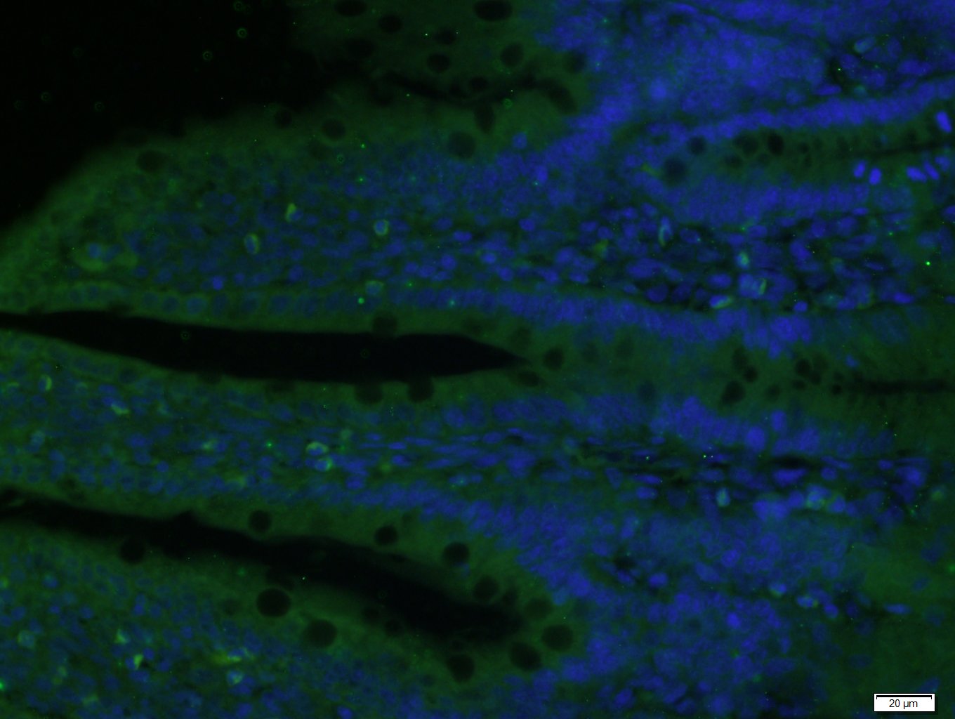 Paraformaldehyde-fixed, paraffin embedded (Rat colon); Antigen retrieval by boiling in sodium citrate buffer (pH6.0) for 15min; Block endogenous peroxidase by 3% hydrogen peroxide for 20 minutes; Blocking buffer (normal goat serum) at 37°C for 30min; Antibody incubation with (TET3) Polyclonal Antibody, Unconjugated (bs-17613R) at 1:400 overnight at 4°C, followed by a conjugated Goat Anti-Rabbit IgG antibody (bs-0295G-FITC) for 90 minutes, and DAPI for nuclei staining.