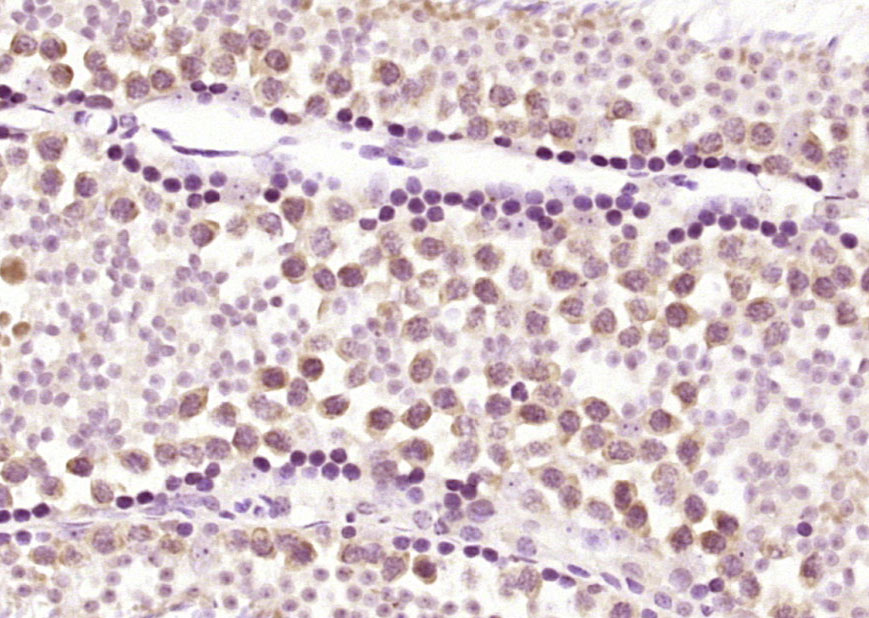 Paraformaldehyde-fixed, paraffin embedded (mouse testis); Antigen retrieval by boiling in sodium citrate buffer (pH6.0) for 15min; Block endogenous peroxidase by 3% hydrogen peroxide for 20 minutes; Blocking buffer (normal goat serum) at 37°C for 30min; Antibody incubation with (TET3) Polyclonal Antibody, Unconjugated (bs-17613R) at 1:200 overnight at 4°C, followed by operating according to SP Kit(Rabbit) (sp-0023) instructionsand DAB staining.