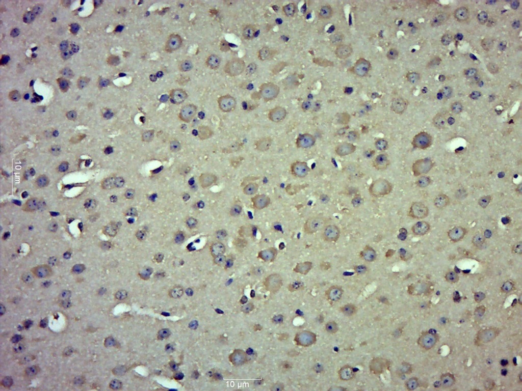 Paraformaldehyde-fixed, paraffin embedded (Mouse brain); Antigen retrieval by boiling in sodium citrate buffer (pH6.0) for 15min; Block endogenous peroxidase by 3% hydrogen peroxide for 20 minutes; Blocking buffer (normal goat serum) at 37°C for 30min; Antibody incubation with (MRPL13) Polyclonal Antibody, Unconjugated (bs-17769R) at 1:500 overnight at 4°C, followed by a conjugated secondary (sp-0023) for 20 minutes and DAB staining.