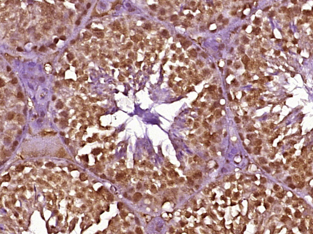 Paraformaldehyde-fixed, paraffin embedded (mouse testis tissue); Antigen retrieval by boiling in sodium citrate buffer (pH6.0) for 15min; Block endogenous peroxidase by 3% hydrogen peroxide for 20 minutes; Blocking buffer (normal goat serum) at 37°C for 30min; Antibody incubation with (MSH5) Polyclonal Antibody, Unconjugated (bs-17852R) at 1:400 overnight at 4°C, followed by operating according to SP Kit(Rabbit) (sp-0023) instructionsand DAB staining.
