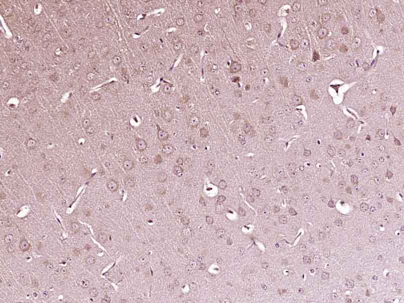 Paraformaldehyde-fixed, paraffin embedded (Mouse brain); Antigen retrieval by boiling in sodium citrate buffer (pH6.0) for 15min; Block endogenous peroxidase by 3% hydrogen peroxide for 20 minutes; Blocking buffer (normal goat serum) at 37°C for 30min; Antibody incubation with (phospho-IKK alpha (Ser176)) Polyclonal Antibody, Unconjugated (bs-18127R) at 1:400 overnight at 4°C, followed by operating according to SP Kit(Rabbit) (sp-0023) instructionsand DAB staining.