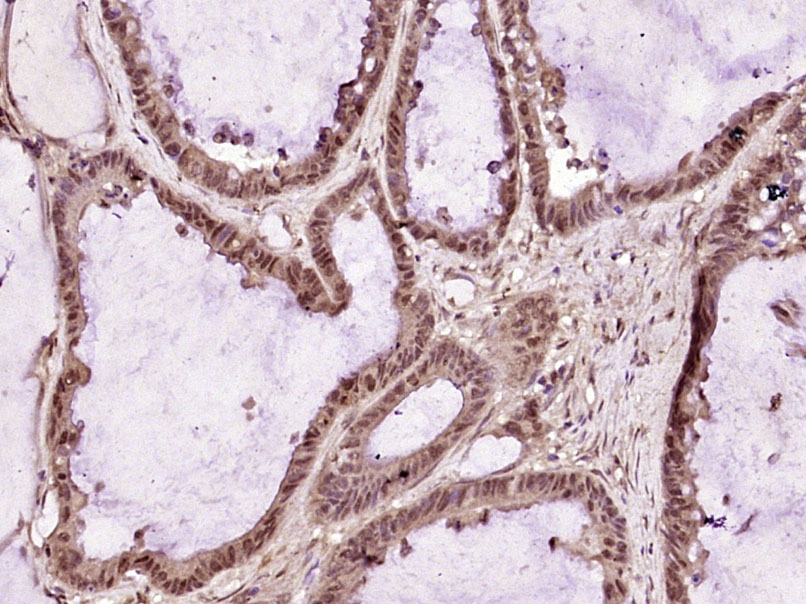 Paraformaldehyde-fixed, paraffin embedded (Human colon carcinoma); Antigen retrieval by boiling in sodium citrate buffer (pH6.0) for 15min; Block endogenous peroxidase by 3% hydrogen peroxide for 20 minutes; Blocking buffer (normal goat serum) at 37°C for 30min; Antibody incubation with (MACROD1) Polyclonal Antibody, Unconjugated (bs-18602R) at 1:400 overnight at 4°C, followed by operating according to SP Kit(Rabbit) (sp-0023) instructionsand DAB staining.