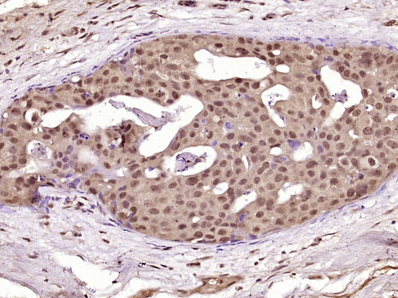 Paraformaldehyde-fixed, paraffin embedded (Human breast carcinoma); Antigen retrieval by boiling in sodium citrate buffer (pH6.0) for 15min; Block endogenous peroxidase by 3% hydrogen peroxide for 20 minutes; Blocking buffer (normal goat serum) at 37°C for 30min; Antibody incubation with (MACROD1) Polyclonal Antibody, Unconjugated (bs-18602R) at 1:400 overnight at 4°C, followed by operating according to SP Kit(Rabbit) (sp-0023) instructionsand DAB staining.