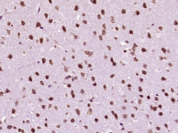 Paraformaldehyde-fixed, paraffin embedded (mouse brain tissue); Antigen retrieval by boiling in sodium citrate buffer (pH6.0) for 15min; Block endogenous peroxidase by 3% hydrogen peroxide for 20 minutes; Blocking buffer (normal goat serum) at 37°C for 30min; Antibody incubation with (C20orf133) Polyclonal Antibody, Unconjugated (bs-18603R) at 1:400 overnight at 4°C, followed by operating according to SP Kit(Rabbit) (sp-0023) instructionsand DAB staining.