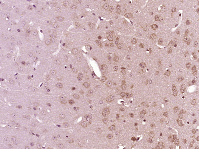 Paraformaldehyde-fixed, paraffin embedded (Mouse brain); Antigen retrieval by boiling in sodium citrate buffer (pH6.0) for 15min; Block endogenous peroxidase by 3% hydrogen peroxide for 20 minutes; Blocking buffer (normal goat serum) at 37°C for 30min; Antibody incubation with (RPS8) Polyclonal Antibody, Unconjugated (bs-18834R) at 1:400 overnight at 4°C, followed by operating according to SP Kit(Rabbit) (sp-0023) instructionsand DAB staining.