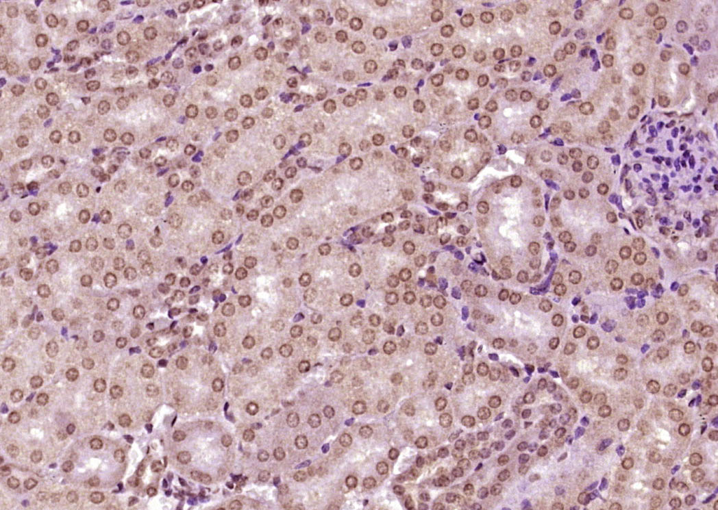 Paraformaldehyde-fixed, paraffin embedded (Mouse kidney); Antigen retrieval by boiling in sodium citrate buffer (pH6.0) for 15min; Block endogenous peroxidase by 3% hydrogen peroxide for 20 minutes; Blocking buffer (normal goat serum) at 37°C for 30min; Antibody incubation with (ZFP72) Polyclonal Antibody, Unconjugated (bs-19130R) at 1:400 overnight at 4°C, followed by operating according to SP Kit(Rabbit) (sp-0023) instructionsand DAB staining.