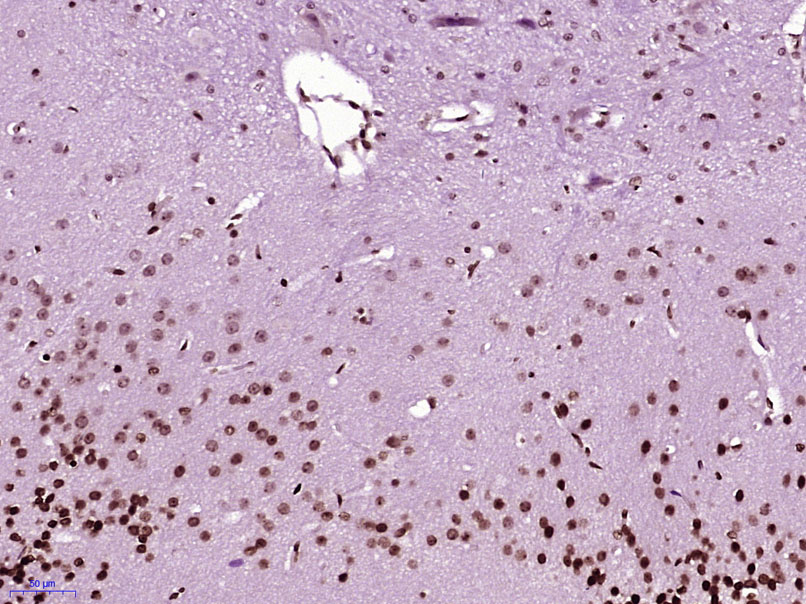 Paraformaldehyde-fixed, paraffin embedded (Rat brain); Antigen retrieval by boiling in sodium citrate buffer (pH6.0) for 15min; Block endogenous peroxidase by 3% hydrogen peroxide for 20 minutes; Blocking buffer (normal goat serum) at 37°C for 30min; Antibody incubation with (NFKBIL1) Polyclonal Antibody, Unconjugated (bs-19224R) at 1:400 overnight at 4°C, followed by operating according to SP Kit(Rabbit) (sp-0023) instructionsand DAB staining.