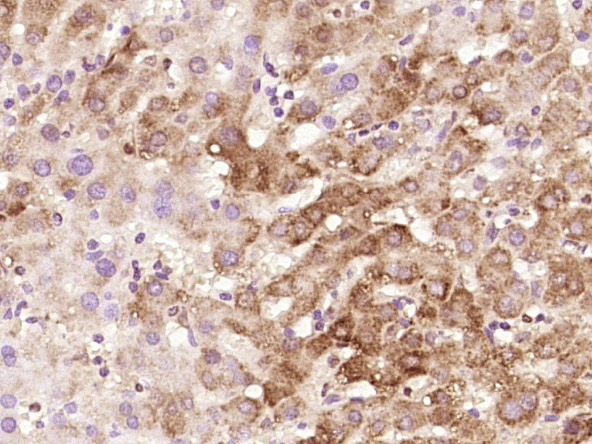 Paraformaldehyde-fixed, paraffin embedded (human liver carcinoma); Antigen retrieval by boiling in sodium citrate buffer (pH6.0) for 15min; Block endogenous peroxidase by 3% hydrogen peroxide for 20 minutes; Blocking buffer (normal goat serum) at 37°C for 30min; Antibody incubation with (NT5C3) Polyclonal Antibody, Unconjugated (bs-19488R) at 1:400 overnight at 4°C, followed by operating according to SP Kit(Rabbit) (sp-0023) instructionsand DAB staining.