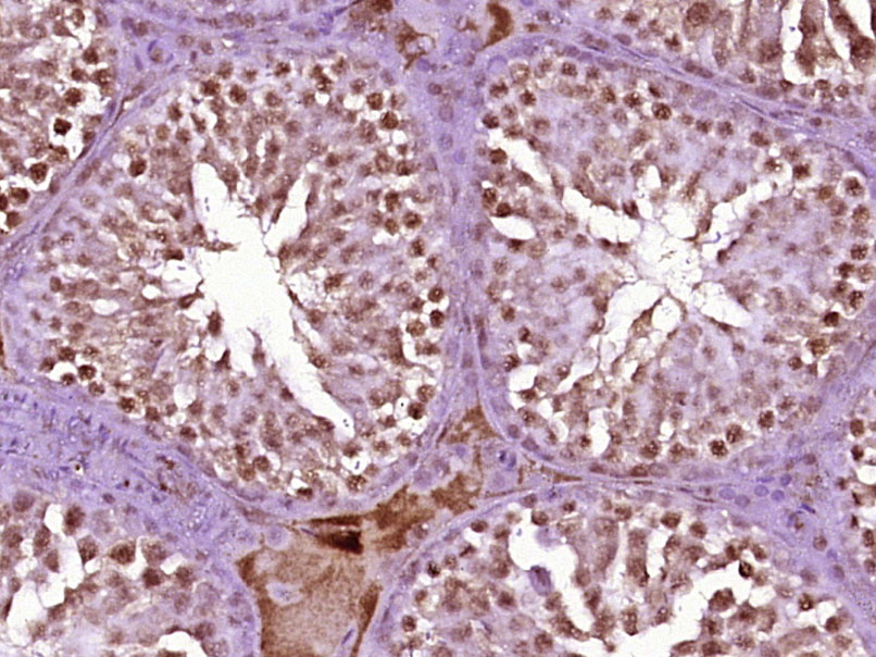 Paraformaldehyde-fixed, paraffin embedded (Rat testis); Antigen retrieval by boiling in sodium citrate buffer (pH6.0) for 15min; Block endogenous peroxidase by 3% hydrogen peroxide for 20 minutes; Blocking buffer (normal goat serum) at 37°C for 30min; Antibody incubation with (SMCHD1) Polyclonal Antibody, Unconjugated (bs-19929R) at 1:400 overnight at 4°C, followed by operating according to SP Kit(Rabbit) (sp-0023) instructionsand DAB staining.