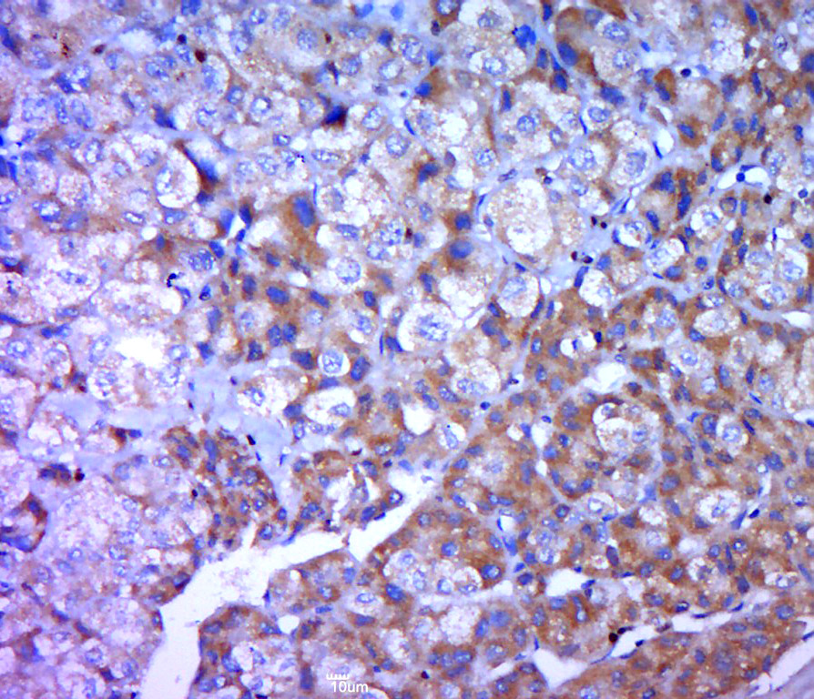 Paraformaldehyde-fixed, paraffin embedded (human liver carcinoma); Antigen retrieval by boiling in sodium citrate buffer (pH6.0) for 15min; Block endogenous peroxidase by 3% hydrogen peroxide for 20 minutes; Blocking buffer (normal goat serum) at 37°C for 30min; Antibody incubation with (Fibrinopeptide A) Polyclonal Antibody, Unconjugated (bs-10080R) at 1:400 overnight at 4°C, followed by a conjugated secondary (sp-0023) for 20 minutes and DAB staining.