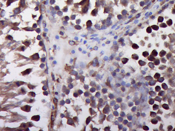 Paraformaldehyde-fixed, paraffin embedded (Rat testis); Antigen retrieval by boiling in sodium citrate buffer (pH6.0) for 15min; Block endogenous peroxidase by 3% hydrogen peroxide for 20 minutes; Blocking buffer (normal goat serum) at 37°C for 30min; Antibody incubation with (P-Cofilin (Ser3)) Polyclonal Antibody, Unconjugated (bs-20261R) at 1:400 overnight at 4°C, followed by operating according to SP Kit(Rabbit) (sp-0023) instructionsand DAB staining.