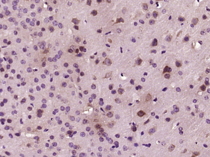Paraformaldehyde-fixed, paraffin embedded (mouse brain tissue); Antigen retrieval by boiling in sodium citrate buffer (pH6.0) for 15min; Block endogenous peroxidase by 3% hydrogen peroxide for 20 minutes; Blocking buffer (normal goat serum) at 37°C for 30min; Antibody incubation with (PKC alpha) Polyclonal Antibody, Unconjugated (bs-23715R) at 1:400 overnight at 4°C, followed by operating according to SP Kit(Rabbit) (sp-0023) instructionsand DAB staining.