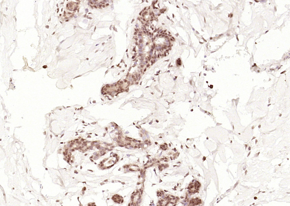 Paraformaldehyde-fixed, paraffin embedded (human breast); Antigen retrieval by boiling in sodium citrate buffer (pH6.0) for 15min; Block endogenous peroxidase by 3% hydrogen peroxide for 20 minutes; Blocking buffer (normal goat serum) at 37°C for 30min; Antibody incubation with (CDKN2 AP14arf) Polyclonal Antibody, Unconjugated (bs-22495R) at 1:400 overnight at 4°C, followed by operating according to SP Kit(Rabbit) (sp-0023) instructionsand DAB staining.