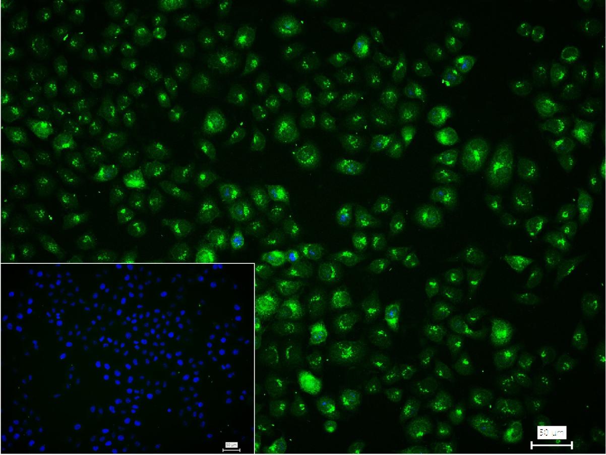 4% Paraformaldehyde-fixed Hela (H) cell; Triton X-100 at r.t. for 20 min; Antibody incubation with (Cyclin B1) monoclonal Antibody, unconjugated (bsm-52044R) 1:100, 90 min at 37°C; followed by conjugated Goat Anti-Rabbit IgG antibody (green, bs-40295G-FITC) at 37°C for 90 min, DAPI (blue, C02-04002) was used to stain the cell nuclei. PBS instead of the primary antibody was used as the blank control.