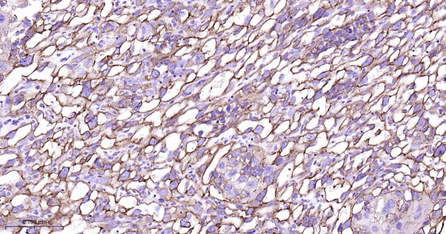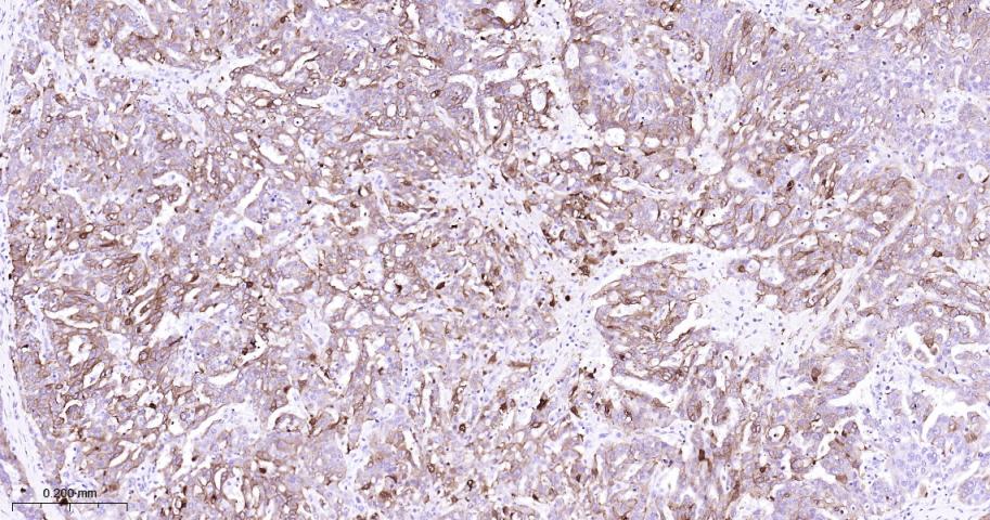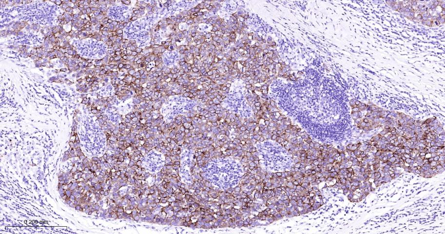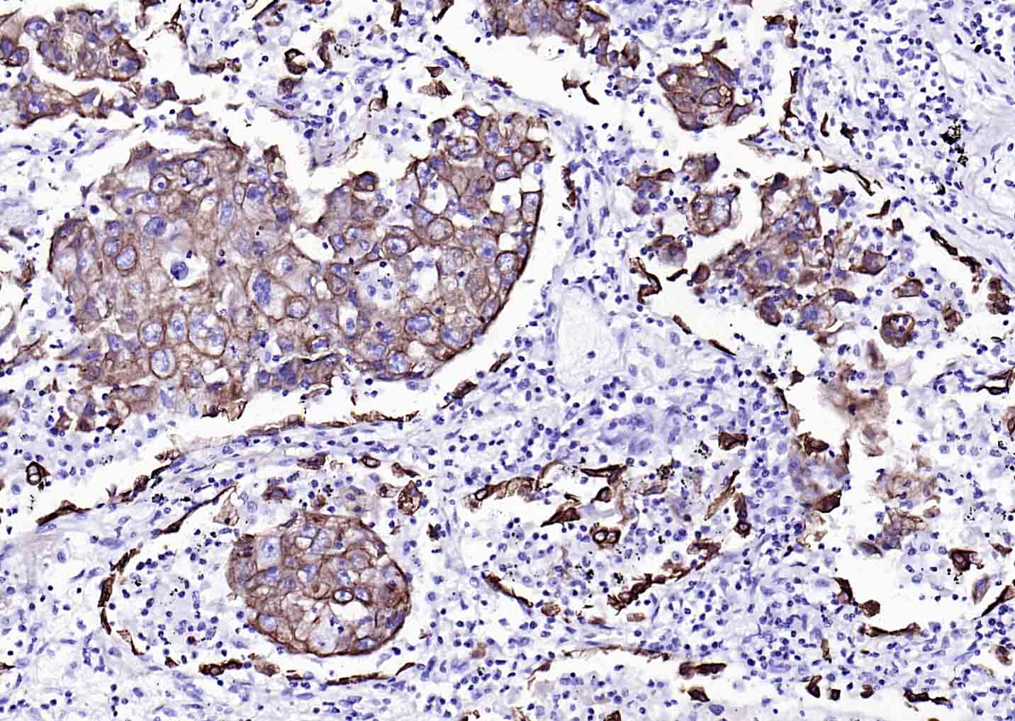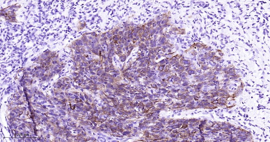 Paraformaldehyde-fixed, paraffin embedded (human lung carcinoma); Antigen retrieval by boiling in sodium citrate buffer (pH6.0) for 15min; Block endogenous peroxidase by 3% hydrogen peroxide for 20 minutes; Blocking buffer (normal goat serum) at 37°C for 30min; Antibody incubation with (Cytokeratin 7) Monoclonal Antibody, Unconjugated (bsm-52065R) at 1:200 overnight at 4°C, followed by operating according to SP Kit(Rabbit) (sp-0023) instructionsand DAB staining.