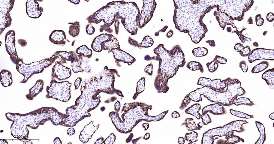 Paraformaldehyde-fixed, paraffin embedded Human placenta; Antigen retrieval by boiling in sodium citrate buffer (pH6.0) for 15 min; Antibody incubation with CK7 Monoclonal Antibody, Unconjugated(bsm-52065R) at 1:200 overnight at 4°C, followed by conjugation to the bs-0295G-HRP and DAB (C-0010) staining.