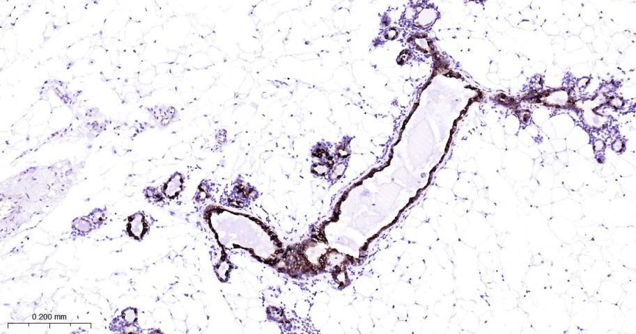 Paraformaldehyde-fixed, paraffin embedded Rat breast; Antigen retrieval by boiling in sodium citrate buffer (pH6.0) for 15 min; Antibody incubation with CK7 Monoclonal Antibody, Unconjugated(bsm-52065R) at 1:200 overnight at 4°C, followed by conjugation to the bs-0295G-HRP and DAB (C-0010) staining.