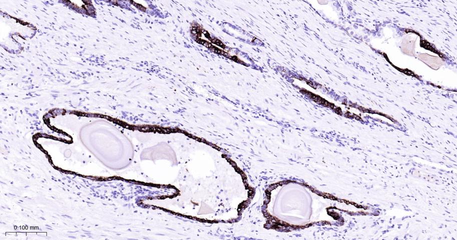 Paraformaldehyde-fixed, paraffin embedded Human prostate; Antigen retrieval by boiling in sodium citrate buffer (pH6.0) for 15 min; Antibody incubation with CK7 Monoclonal Antibody, Unconjugated(bsm-52065R) at 1:200 overnight at 4°C, followed by conjugation to the bs-0295G-HRP and DAB (C-0010) staining.